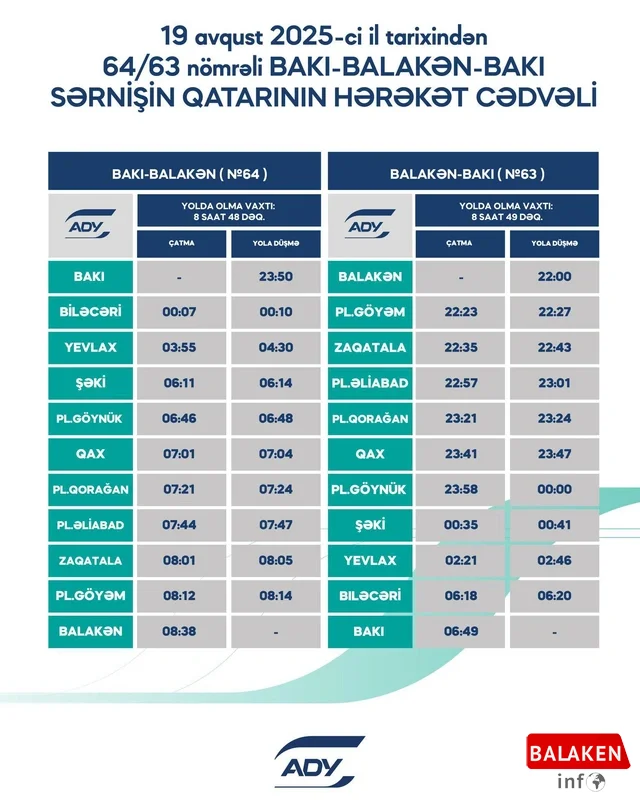 Bakı–Balakən qatarlarının hərəkət cədvəlində dəyişiklik edilib Redaktor 19-08-2025, 14:28 Cəmiyyət 1 967 Azərbaycanda rayonlararası sərnişin qatarlarının qrafikində dəyişikliklər olunub."Azərbaycan Dəmir Yolları" QSC-dən balaken.info- ya verilən məlumata görə, Bakı–Keşlə sahəsində aparılan təmir işləri ilə əlaqədar olaraq Bakı–Balakən–Bakı marşrutu üzrə sərnişin qatarları bu gündən etibarən yenilənmiş hərəkət cədvəli ilə fəaliyyət göstərir. Şahidi olduğunuz hadisələri çəkib bizə göndərin! 7/24 whatsapp 0 1 2 3 4 5 Paylaş