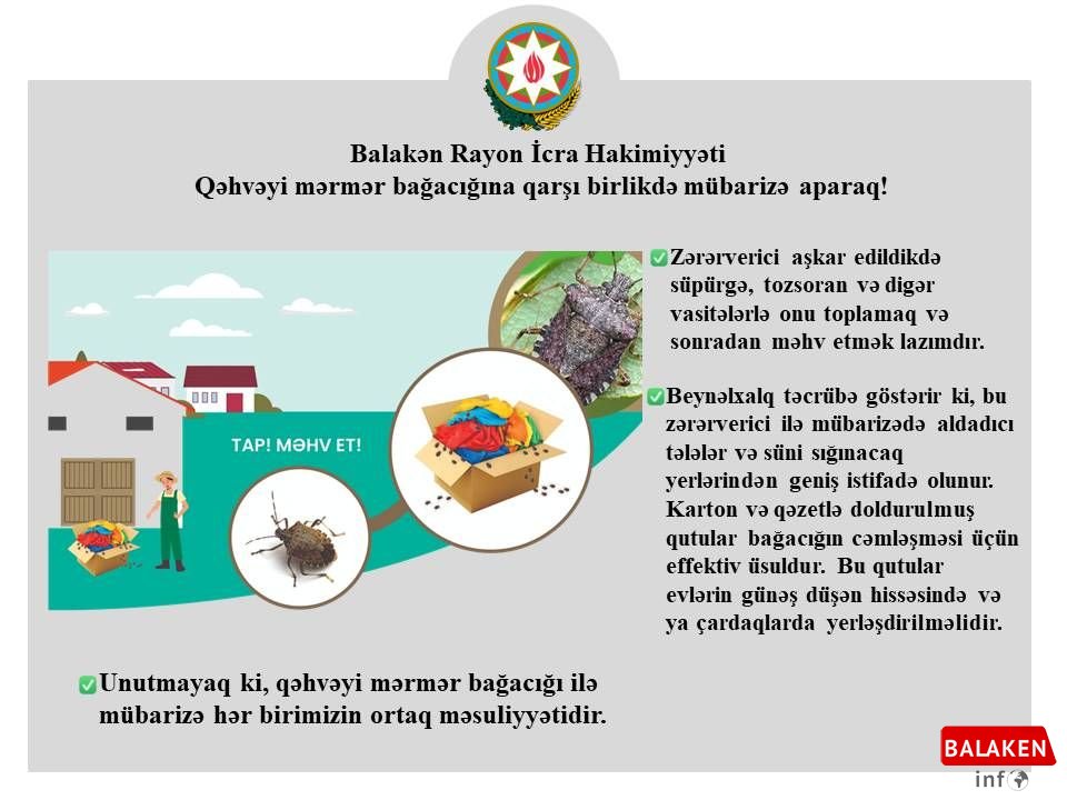 Balakən rayonunda qəhvəyi mərmər bağacığına qarşı mübarizə tədbirləri gücləndirilir Redaktor 26-01-2026, 22:14 Cəmiyyət / Bölgə 233 Balakən Rayon İcra Hakimiyyəti tərəfindən kənd təsərrüfatına ciddi ziyan vuran qəhvəyi mərmər bağacığına qarşı mübarizə tədbirləri davam etdirilir. Mütəxəssislər və aidiyyəti qurumlar bu təhlükəli zərərverici ilə mübarizədə vətəndaşların da fəal iştirakının vacibliyini vurğulayırlar.Bildirilir ki, zərərverici aşkar edildikdə onu süpürgə, tozsoran və digər mexaniki vasitələrlə toplayaraq sonradan məhv etmək lazımdır. Bu üsul bağacığın yayılmasının qarşısını almaqda effektiv hesab olunur.Beynəlxalq təcrübə göstərir ki, qəhvəyi mərmər bağacığı ilə mübarizədə aldadıcı tələlər və süni sığınacaqlardan geniş istifadə edilir. Xüsusilə karton və qəzetlə doldurulmuş qutular bağacığın toplanması üçün səmərəli üsul sayılır. Bu qutular evlərin günəş düşən hissəsində və ya çardaqda yerləşdirilməlidir.Balakən Rayon İcra Hakimiyyəti bir daha sakinlərə müraciət edərək bildirir ki, qəhvəyi mərmər bağacığı ilə mübarizə hər birimizin ortaq məsuliyyətidir. Bu sahədə birgə və vaxtında görülən tədbirlər kənd təsərrüfatı məhsullarının qorunmasında mühüm rol oynayır. Şahidi olduğunuz hadisələri çəkib bizə göndərin! 7/24 whatsapp 0 1 2 3 4 5 Paylaş